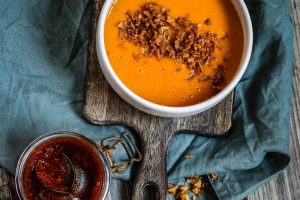 Harissa-tahnalla maustettu kurpitsakeitto on täydellistä syysruokaa! Eikä vaadi valmistamiseen kuin muutaman raaka-aineen.
