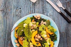 Ihana syksyinen kurpitsasalaatti sitruunapavuilla ja hernetahnalla.