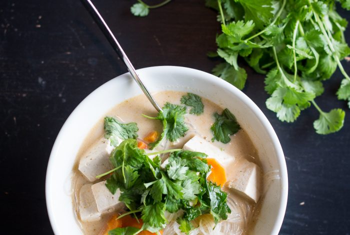 Mungpavuista valmistetut lasinuudelit, tofu ja mausteinen kookosmaitoliemi tekevät yhdessä mainion arkikeiton!