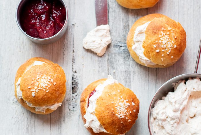 Maapähkinävoikermavaahdolla ja hillolla täytetyt vegaaniset laskiaispullat.