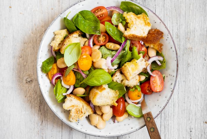 Alkusyksyn tomaattisato kannattaa upottaa tähän valkoisilla pavuilla höystettyyn klassikkosalaattiin.