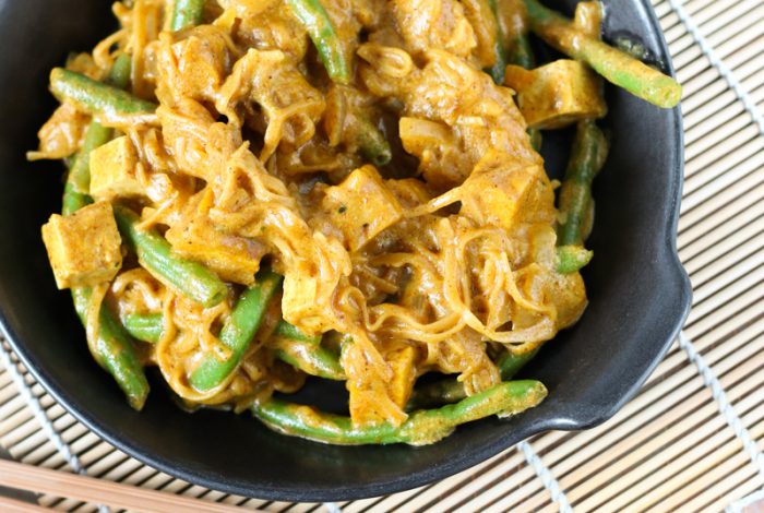 Lupiinitempeä, kikhernenuudeleita, kookosmaitoa ja papuja, nam! Tämä curry valmistuu kymmenessä minuutissa – täydellistä arkiruokaa siis!
