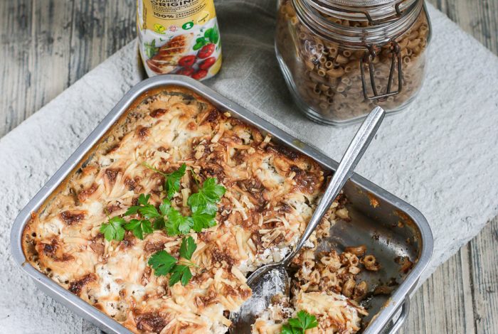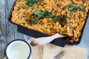 Makaronilaatikon vegaaninen sesonkiversio syntyy kantarelleista ja linsseistä. Nam!