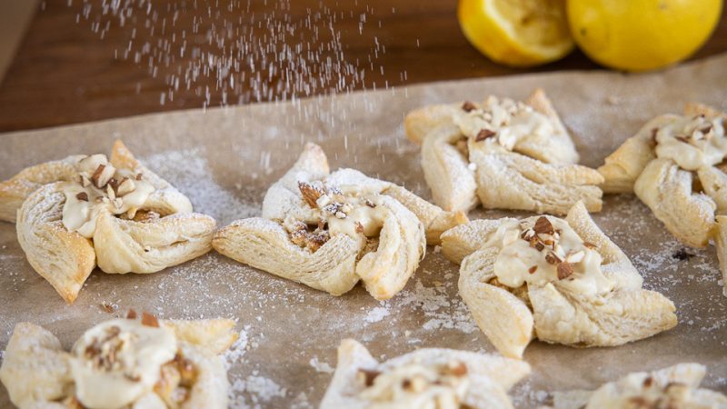 Mantelilla täytetyt ja sitruunatuorejuustolla kuorrutetut joulutortut