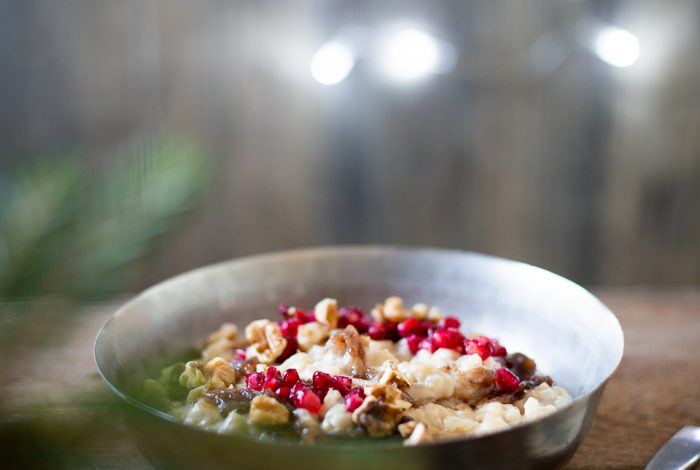 Mantelimaitoon keitetty kermainen riisipuuro taatelihillolla ja granaattiomenalla.