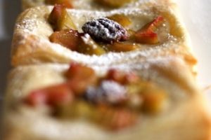 Jos sunnuntaina sattuu olemaan vapaapäivä, en yleensä viitsi vaivautua kauppaan, vaan kehittelen mieluummin jotain syötävää olemassa olevista aineksista ja makoilen loppupäivän sohvalla elokuvien parissa. Tällä kertaa pakastimesta löytyi raparperia ja lehtitaikinaa.