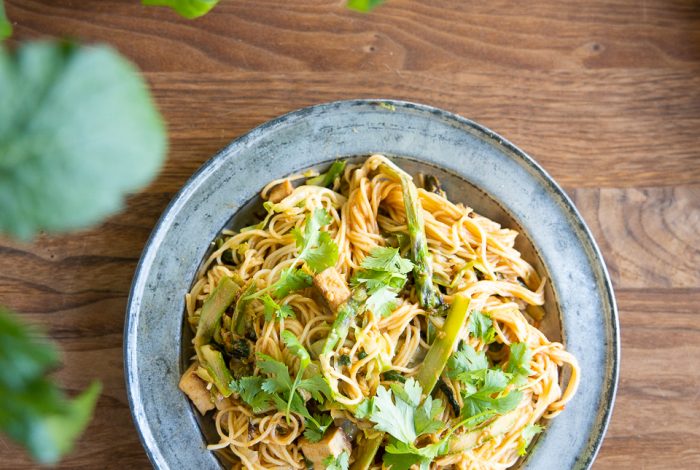 Keväinen nuudeliruoka sisältää parsaa, varhaiskaalia, tofua ja täyteläisen seesamikastikkeen.