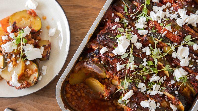 Herkullinen uunivuoka kauden kasviksista ja linsseistä.