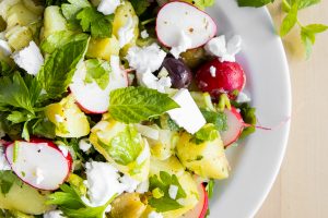 Raikas sitruunainen perunasalaatti vegaanisella fetalla.