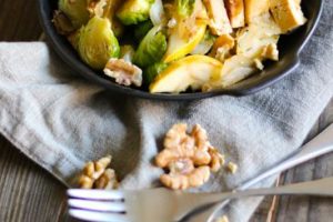 Syksyinen helppo arkiruoka paistuu pannulla. Ruusukaaleja, savutofua ja happamia omenoita sekä mausteeksi hiukan vaahterasiirappia ja rosmariinia.