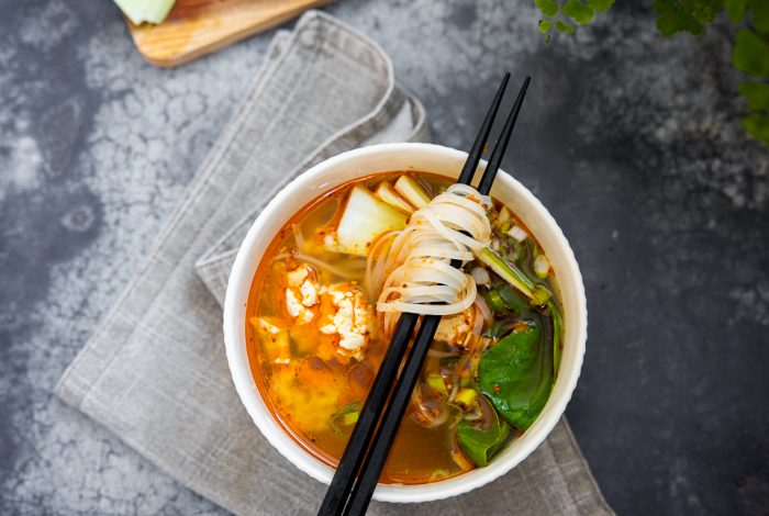 Yhdessä kulhossa valmistuva maapähkinäinen nuudelikeitto.
