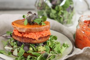 Yhteistyössä Anamma – Vegepihvillä ja paahdetuista paprikoista tehdyllä tahnalla täytetyt bataattiburgerit ovat täydellistä vaikkapa pääsiäispöydässä!