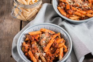 Paahdetusta paprikasta ja munakoisosta sekä belugalinsseistä syntyy ihana ruokaisa pasta.
