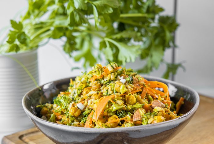 Cashewkermalla maustettua pastaa, pestokikherneitä ja rapeaa parsakaalia. Helppo ja hyvä lounassalaatti on tässä!