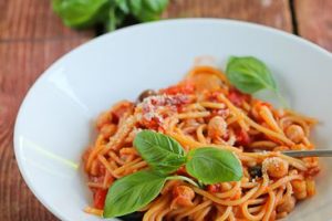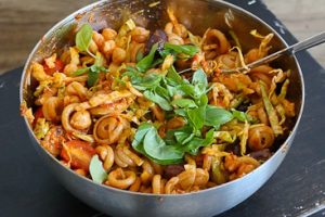 Paahdetusta paprikasta ja munakoisosta sekä belugalinsseistä syntyy ihana ruokaisa pasta.
