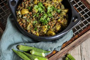 Okrasta, uusista perunoista ja linsseistä pyöräyttää nopeasti helpon curryn.