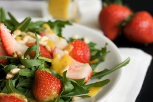 Vellipoika järjesti tämän kuun ruokahaasteen, ja minäkin pääsin vihdoin osallistumaan. Ruokahaasteet ovat yleensä vaatineet jonkun vegaanille sopimattoman raaka-aineen käyttöä, mutta tällä kertaa aiheena oli värit. Ruoka sai olla muodoltaan mitä tahansa, kunhan sen pääraaka-aineet sisältävät kolmea väriä: punaista, keltaista ja vihreää. Chocochili osallistuu kisaan mansikka-rucolasalaatilla ja chili-persikkakastikkeella.