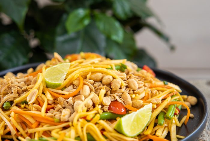 Superherkullinen nuudelisalaatti täyteläisellä maapähkinäkastikkeella.