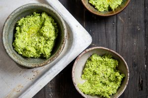 Orzo-pastaa hernekastikkeella ja varsiparsakaaleilla.