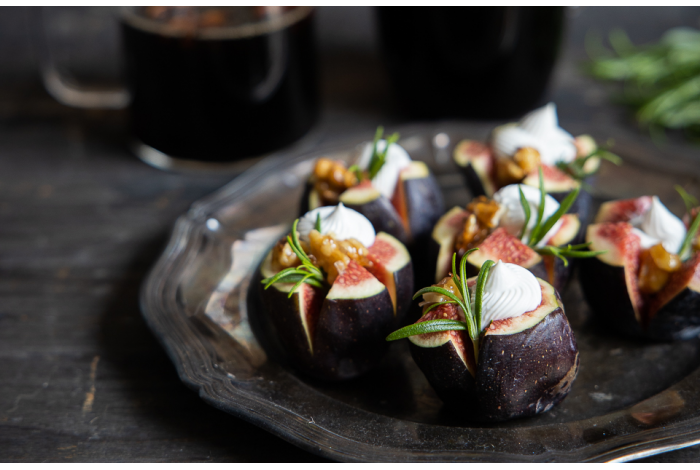 Tuoreet viikunat täytetään vegaanisella vuohenjuustolevitteellä, karamellisoiduilla saksanpähkinöillä ja rosmariinilla.