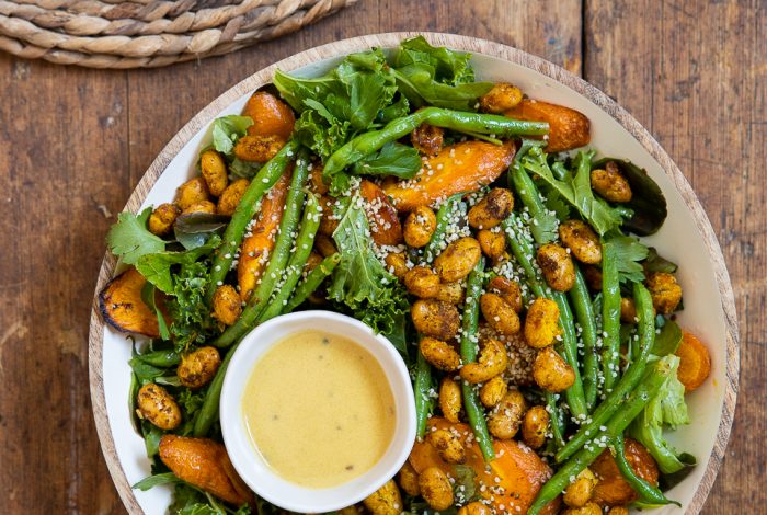 Tässä ruokaisassa salaatissa on uunissa paahdettuja jättipapuja, sitruunaisia leikkopapuja, paahdettua porkkanaa ja muita loppukesän herkkuja.