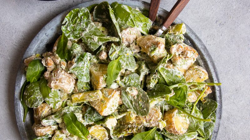 Paistetut kikherneet ja superkermainen kastike kruunaavat tämän salaatin.