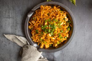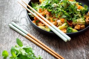 Tulisella gochujang-chilitahnalla maustetut nuudelit varhaiskaalilla ja tofulla.