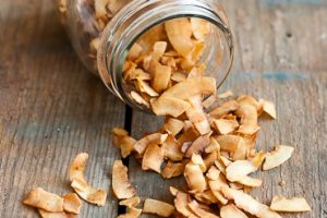 Tämä resepti on läheistä sukua vegepekonille, mutta tällä kertaa se syntyi soijahiutaleiden sijaan kookoslastuista.
