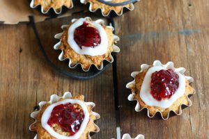 Maapähkinävoilla ja vadelmahillolla täytetyt joulutortut.
