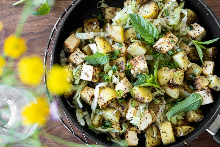Tofuhalloumista, uusista perunoista, varhaiskaalista ja kauden yrteistä valmistettu pyttis on täydellistä kesäruokaa!